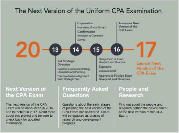 目前美国注册会计师协会已经公布《美国注册会计师考试改革征求意见稿》(Invitation Comment:Maintaining the Relevance of the Uniform CPA Examination),邀请各方面专业人士参与评论。2015年将在收集各方面建议和意见的基础上,出台《征求意见草案>(Exposure Draft)。2016年将正式公布新版考试规则,并与2017年开始执行全新的考试政策。