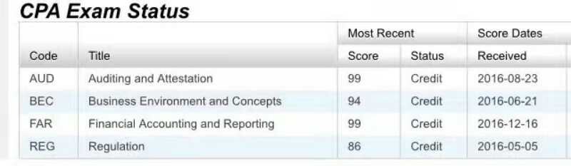 6.刘同学,本科信息系统专业,硕士金融专业,8年工作经验,之前在四大做审计,目前在企业做内审,外派到美国。1年多的时间通过四科考试。其中FAR和AUD满分,四科平均分超过94分。