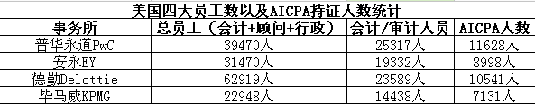 上图是“四大”会计师事务所AICPA持证人数的统计,持证人数还是相当多的。很多会计人都说:“不想去四大会计师事务所工作的AICPA持证人,不是一个好会计”,很多考上报考AICPA都是为了实现自己的四大梦。当然,在中国,AICPA持证人也会有更多更广的就业机会。选择四大,可以利用AICPA证书赋予的专业财务技能开辟出属于自己的职业晋升路。